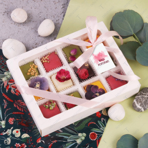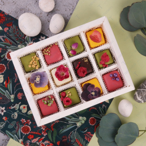 • Шоколад белый, молочный, шоколад темный, какао-масло, глазурь, сублимированные ягоды, сушеные цветы, фисташка, сахарная посыпка, марципан, начинка в ассортименте