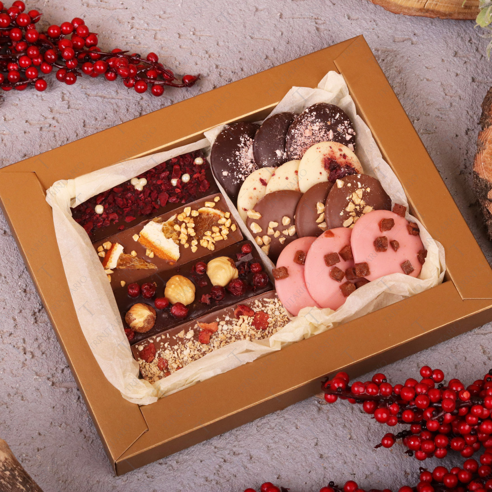 Батончик из темного шоколада с золоченым фундуком и брусникой
